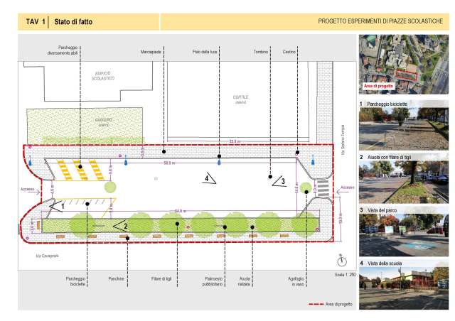 “La città va a scuola/Esperimenti di piazze scolastiche”, progetto sostenuto dalla Fondazione Compagnia di San Paolo, mira a sensibilizzare, gli enti pubblici e le comunità scolastiche e territoriali, sullo stato delle piazze scolastiche e sugli effetti che esse generano su scolari e studenti in termini di percezione urbana, attraverso temi come bellezza/comfort, accessibilità/mobilità, sicurezza, qualità dell’aria/salute/mitigazione, socialità, governance.